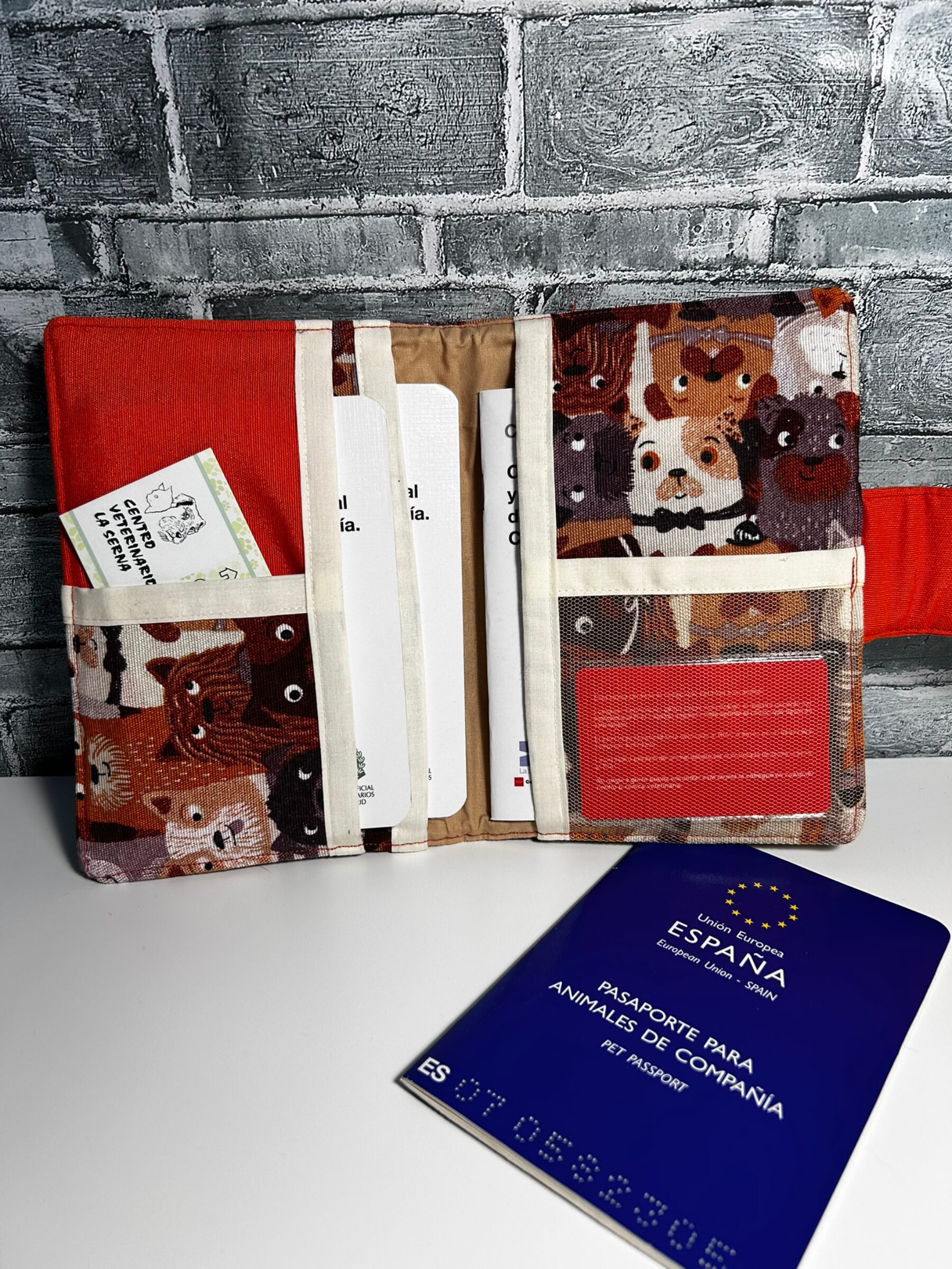 Dispone de tres departamentos grandes, ideales para cartillas veterinarias, pasaporte europeo, pólizas de seguro o recetas, y dos bolsillos pequeños, pensados para organizar tarjetas o anotaciones. Uno de ellos incorpora una rejilla transparente, perfecta para usar como tarjetero.